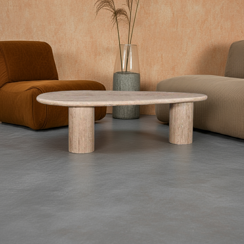 Crafted from natural travertine stone, BORCE coffee table exemplifies organic, minimalist, and serene home aesthetic.