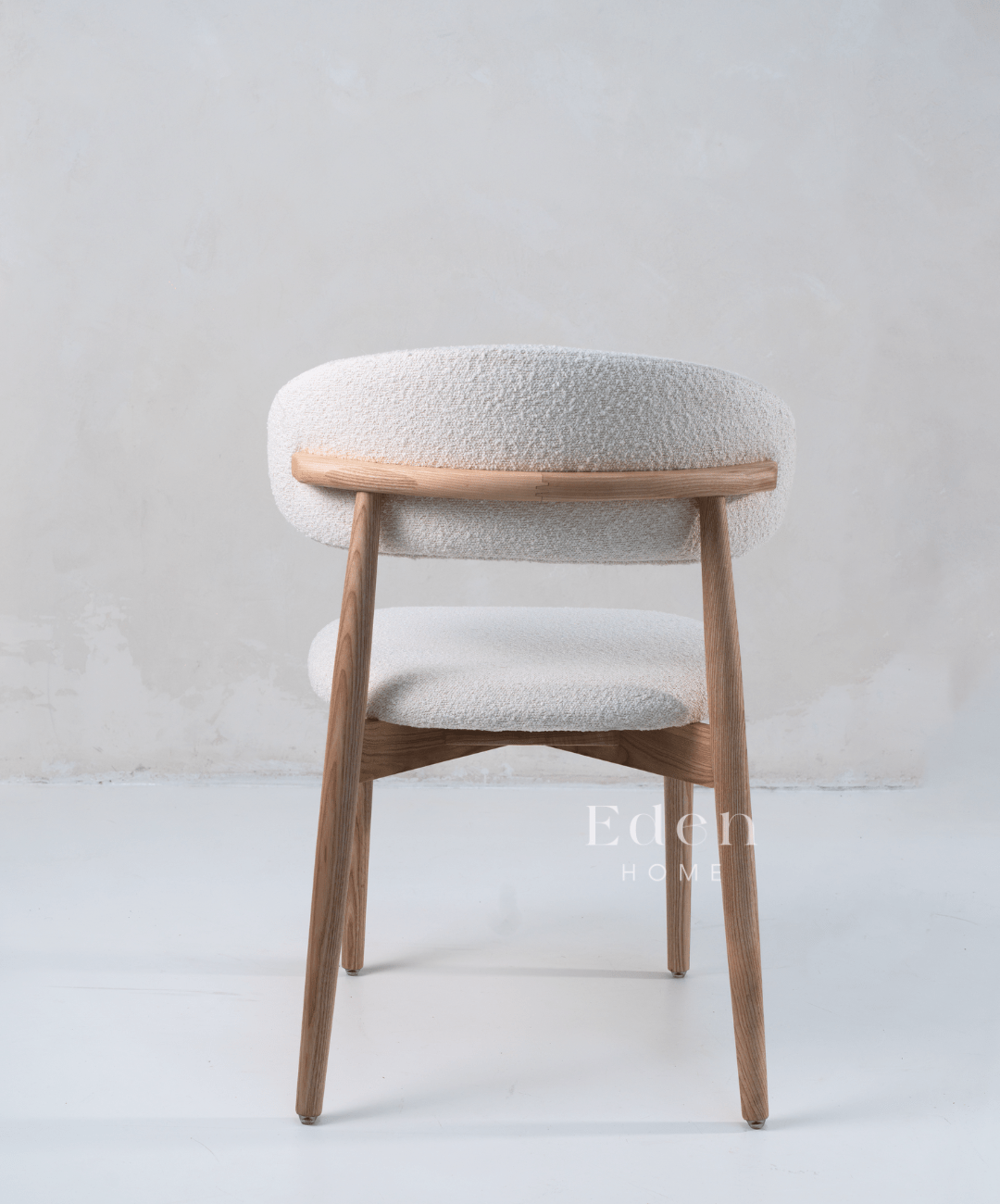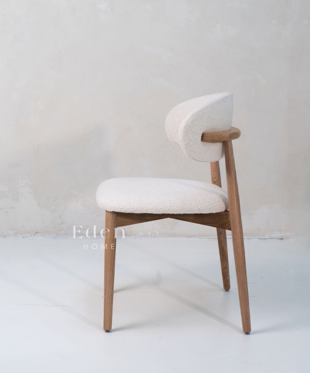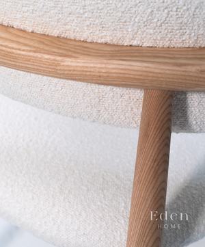 Natural ash frame features stunning natural wood grain complimented by textured boucle seat and back to add a designer touch to your dining area.