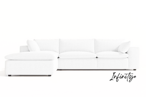 Designed and built for superior functionality and sophisticated modern style, INFINITY+ model features 3 sofa modules and 1 large ottoman with hidden storage inside. Fully washable and removable slipcovers give you an option to change the entire look of your sofa by replacing slipcovers.