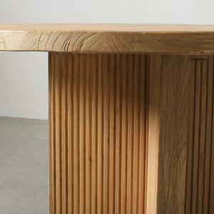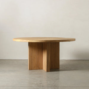 The ODIN Round Dining table showcases the natural beauty of natural Oak wood grain pattern and defined sculptural form.